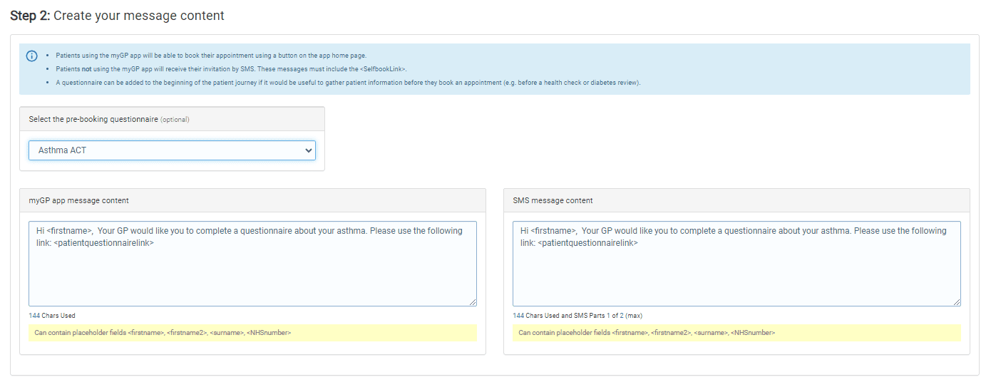 - If you select to send a Patient Questionnaire as well, a message will be pre-populated for you. Usual for things like Asthma and Diabetic reviews.